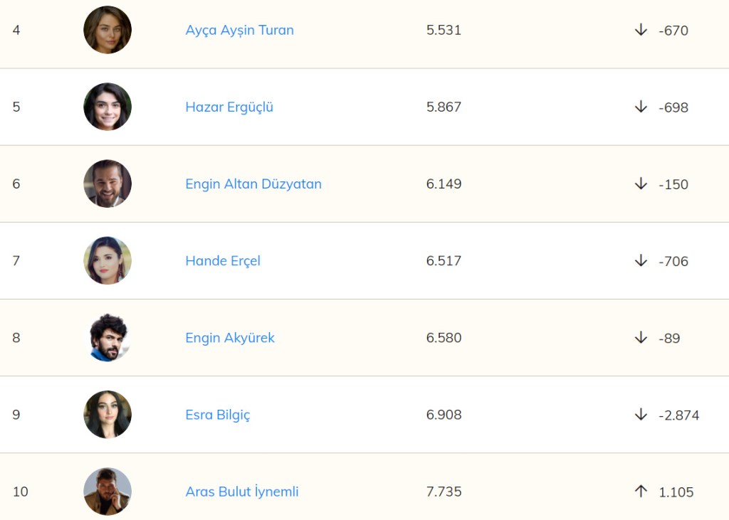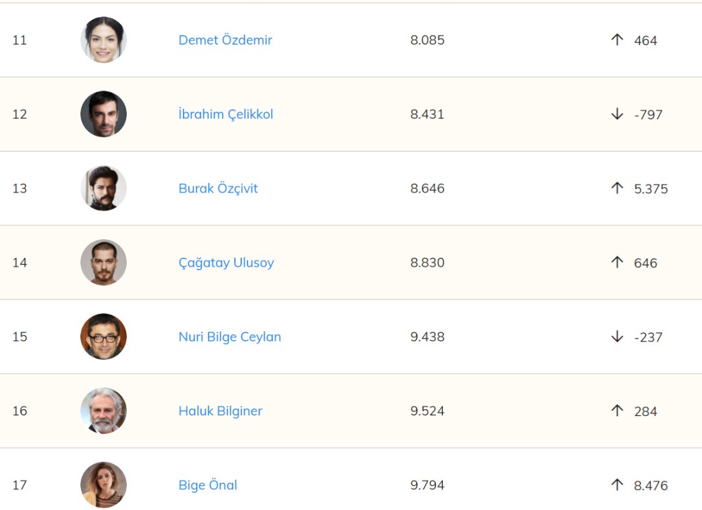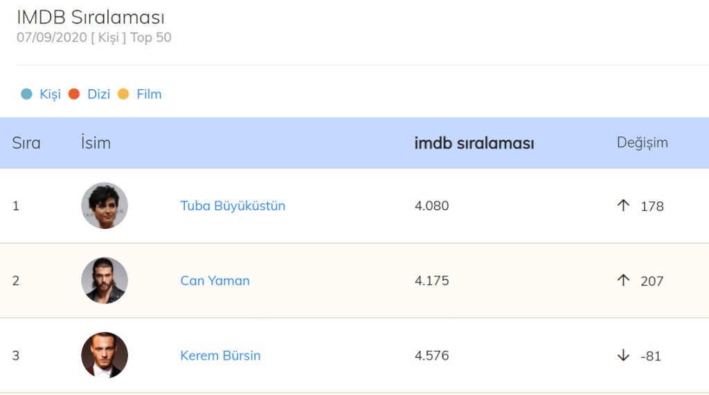 Săptămâna aceasta, clasamentul IMDb al actorilor turci este condus de Tuba Büyüküstün în urcare cu 178 locuri și pe locul 4080 mondial. Este urmată de Can Yaman, în urcare cu 207 locuri și pe locul 4175 mondial. Pe locul al treilea se situează Kerem Bürsin, în coborâre cu 81 locuri și aflat pe locul 4576 mondial.
