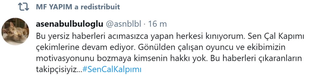 „Îi condamn pe toți cei care scriu fără milă astfel de știri nefondate. Filmările Sen çal kapımı continuă. Nimeni nu are dreptul să strice motivația actorilor și echipei care muncesc din suflet. Suntem cu ochii pe cei care lansează astfel de știri.„ (Asena Bülbüloğlu)
