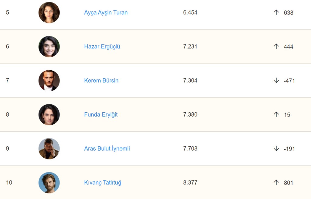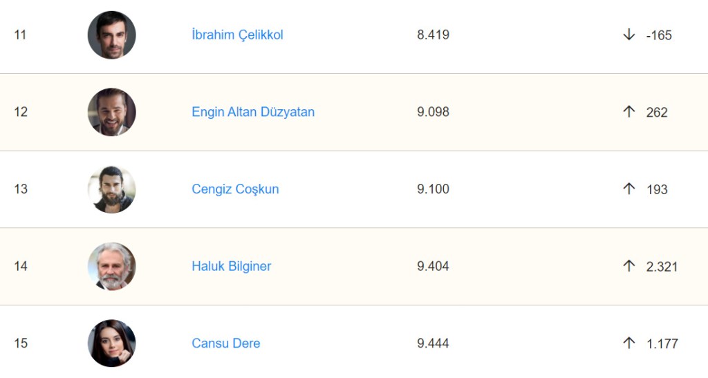 Pe locul al treilea este Can Yaman, pe locul 6.158 mondial, cu o coborâre de 584 locuri.