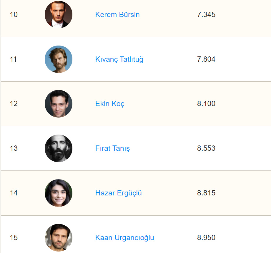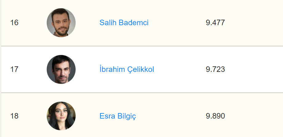 Clasamentul actorilor turci din prestigioasa bază de date IMDb are în frunte pe Hande Erçel care a ajuns pe locul 4.326 în clasamentul internațional, cu o ascensiune de 5 locuri.