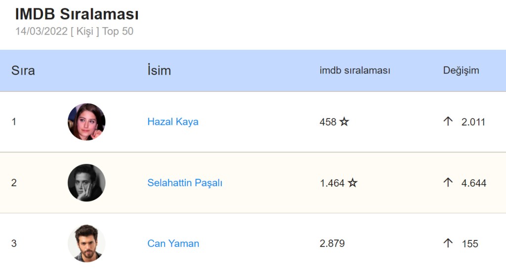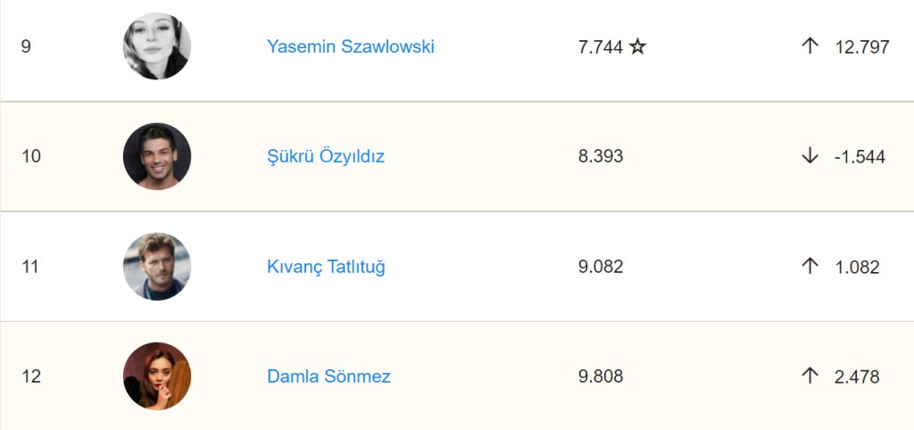Iar SOCIPOL, baza de date din Turcia, publică săptămânal clasamentul actorilor turci din IMDb.