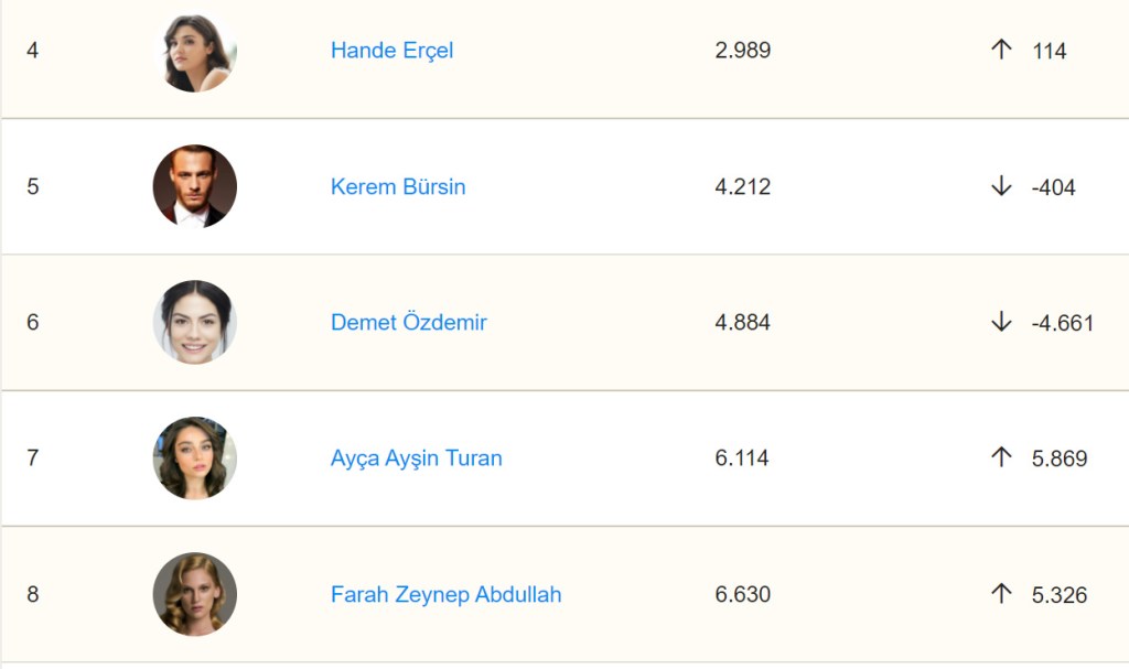 Podiumul săptămânii este completat de Selahattin Paşalı, care, odată cu revenirea pe Netflix, a urcat 4.644 de locuri și a ajuns pe locul 1.464 și Can Yaman care rămâne în centrul atenției, urcă 155 de locuri și ajunge pe locul 2.879 în clasamentul internațional.