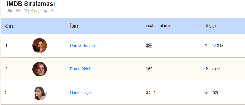 Damla Sönmez are săptămâna aceasta o ascensiune de 12.013 locuri și ajunge pe locul 326 în clasamentul general al prestigioasei baze de date IMDb și pe primul loc între actorii turci.