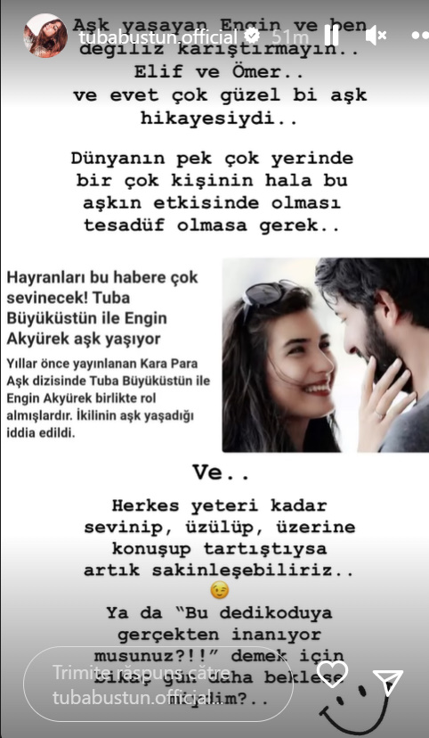 Tuba Büyüküstün a reacționat față de acest zvon scriind în Instagram Stories: „Cei care trăiesc dragostea sunt Elif și Ömer, nu eu şi Engin. Nu confundați. Și, da, a fost o foarte frumoasă poveste de dragoste. Nu ar trebui să fie o coincidență faptul că mulți oameni, din multe părți ale lumii, sunt încă sub influența acestei iubiri.„