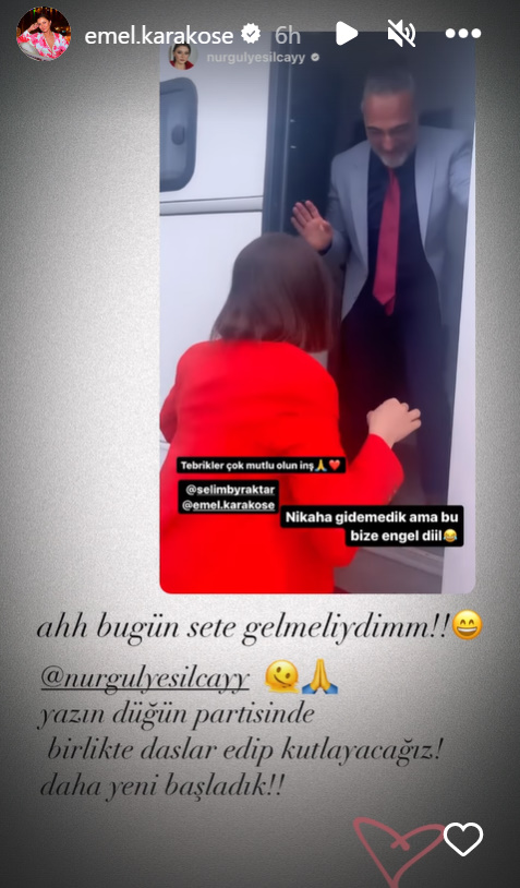 Colega din actualul serial („Veda Mektubu/Scrisoarea de adio), actrița Nurgül Yeşilçay, nu a putut ajunge la nuntă, dar a respectat tradiția și i-a prins mirelui în piept o monedă din aur.