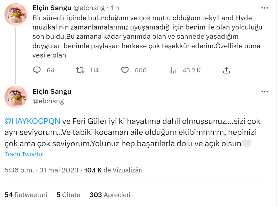„Din pricina nepotrivirii timpului nostru, musicalul Jekyll and Hyde, în care sunt de o vreme și cu care sunt foarte fericită, a încheiat parcursul pe care îl are cu mine.