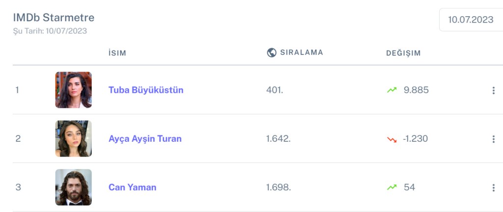 Îndrăgita actriță Tuba Büyüküstün a înregistrat o ascensiune de 9885 locuri în clasamentul IMDb al săptămânii și ajunge în vârful clasamentului actorilor turci și pe locul 401 în clasamentul mondial.