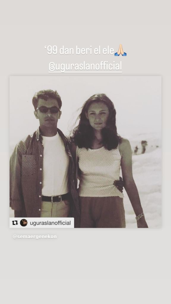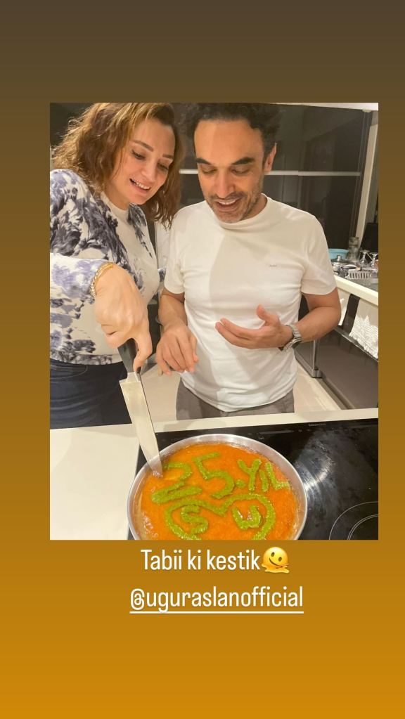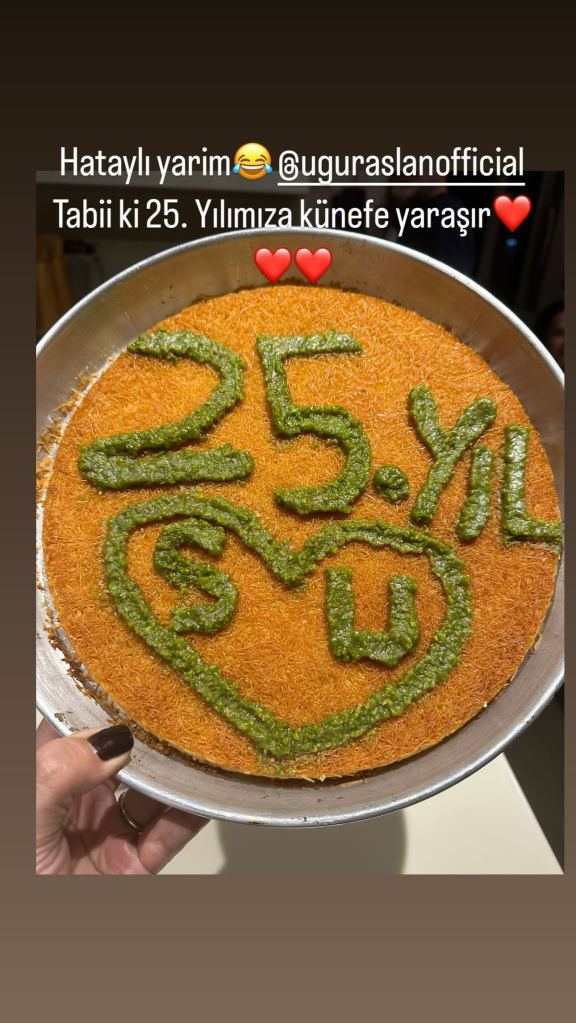 Sema Ergenekon a scris pe Insta Stories: „Jumătatea mea din Hatay. Bineînțeles, künefe este demn de aniversarea noastră de 25 de ani” și a postat o fotografie în care taie împreună nu tort, ci desertul care provine din Hatay, localitatea în care s-a născut soțul său.