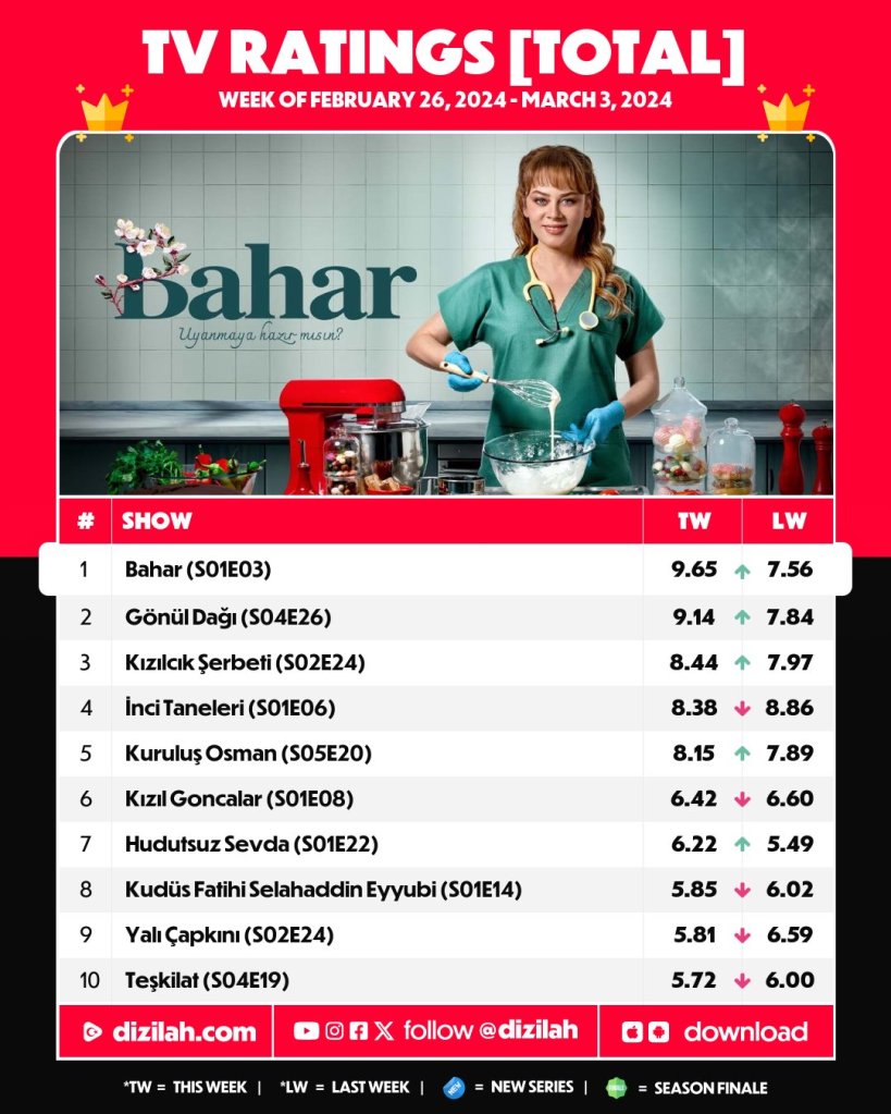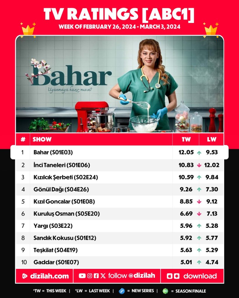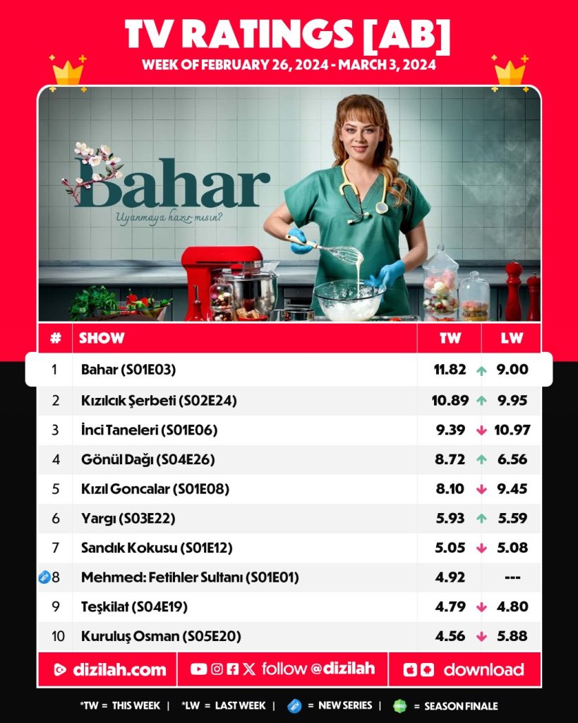 Producția MF Yapım, difuzată la SHOW TV, cu Demet Evgar, Buğra Gülsoy, Mehmet Yılmaz Ak, Ecem Özkaya, Füsun Demirel, Elit Andaç Çam, Demirhan Demircioğlu, Nil Sude Albayrak, Alisa Sezen Sever, Hasan Şahintürk, Sena Mia Kalıp și Hatice Aslan, ocupă, pentru a treia săptămână consecutiv, fotoliul de lider de audiență la toate cele trei categorii de public.