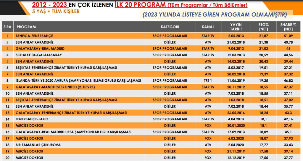 TİAK* a publicat clasamentul celor mai vizionate 20 de programe în perioada 2012-2023.