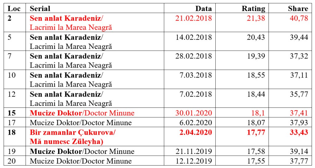 - Bir zamanlar Çukurova/ Mă numesc Züleyha) (locul 18)
