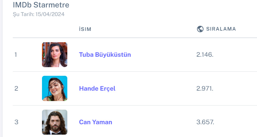 Tuba Büyüküstün este pe primul loc în clasamentul actorilor turci din prestigioasa bază de date IMDB. Actrița se situează săptămâna aceasta pe locul 2.146 în clasamentul mondial.