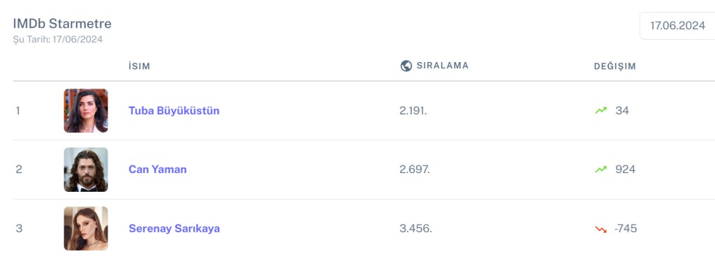 Turcia are săptămâna aceasta 12 nume în TOP 10.000 IMDb. Prestigioasa bază de date conține peste unsprezece milioane de nume din industria cinematografiei și a televiziunii.