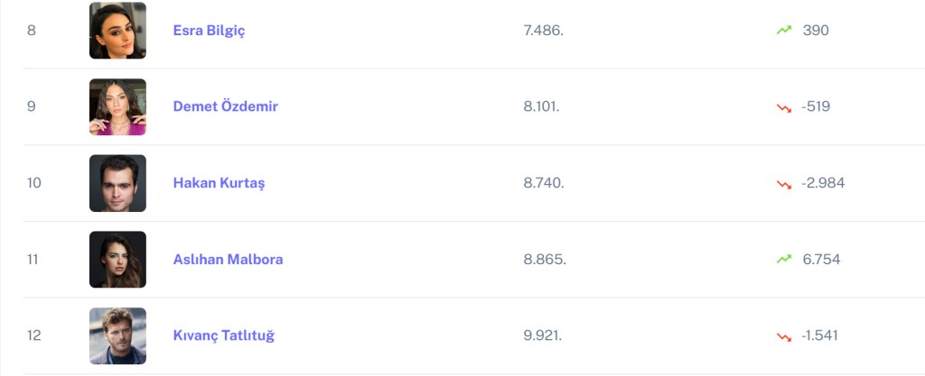 Podiumul este completat de Can Yaman (2697) şi Serenay Sarıkaya (3456).