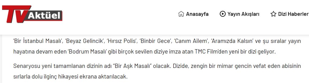 De altfel, presa vremii face referire la acel proiect. Ar fi trebuit să se numească „Bir aşk masalı/O poveste de dragoste„ și urma să aducă povestea interesantă a fratelui decetat al unui arhitect bogat.