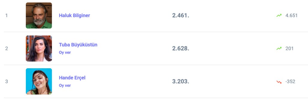 Clasamentul săptămânal al actorilor turci din prestigioasa bază de date IMDb este condus de Haluk Bilginer care a interpretat rolul Aristotel Onassis în filmul „Maria” cu Angelina Jolie, film despre viața celebrei soprane Maria Callas.