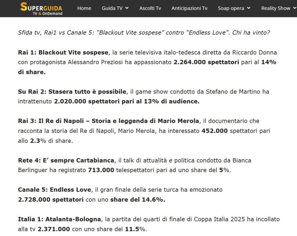 Serialul Kara Sevda (Endless Love), difuzat în Italia de Canale 5, a fost lider de audiență cu episodul final care a fost urmărit de 2.728.000 telespectatori și a înregistrat 14.6% share.