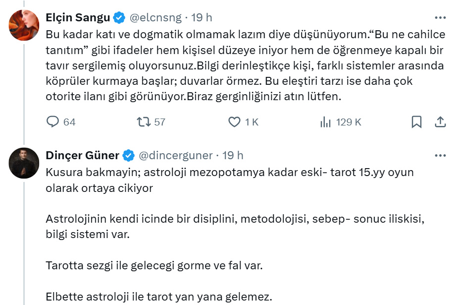 Comentariul altcuiva: „Doamnă Elçin, dacă și dumneavoastră faceți așa, vai de noi… Astrologia e deja un domeniu atât de greșit înțeles, o știință străveche cu calcule și reguli precise. Prin acest videoclip, contribuiți la această percepție greșită, iar profesorul [Güner] asta spune, cere respect.”
