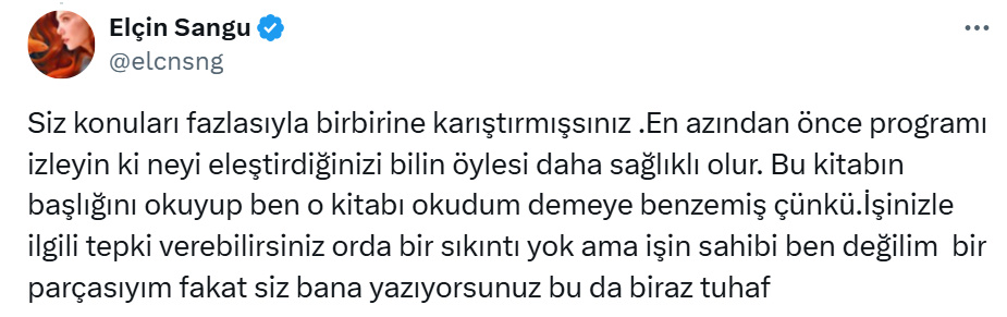 Elçin Sangu: „Îmi pare rău, dar ați amestecat prea mult lucrurile. Măcar uitați-vă la emisiune mai întâi, ca să știți ce criticați, ar fi mai sănătos așa. E ca și cum ai spune că ai citit o carte doar uitându-te la copertă. Puteți reacționa în legătură cu profesia dumneavoastră, nicio problemă, dar eu nu sunt proprietarul emisiunii, sunt doar o parte din ea. Totuși, mie îmi scrieți, ceea ce e cam ciudat.”