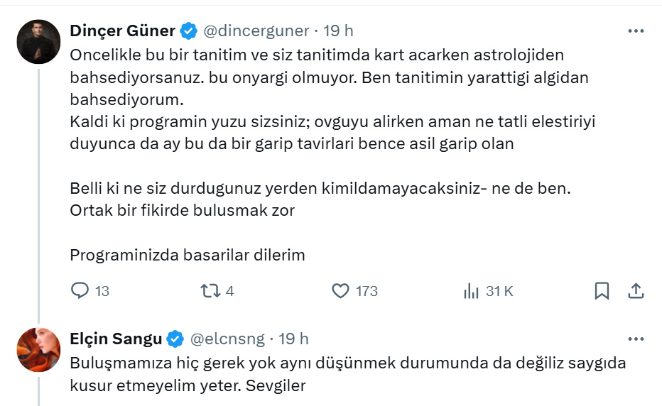 Dinçer Güner: „În primul rând, ăsta e un videoclip de promovare, iar dacă vorbiți despre astrologie în timp ce arătați cărți de tarot, asta nu e prejudecată. Eu vorbesc despre percepția creată de videoclip. În plus, dumneavoastră sunteți imaginea emisiunii; când primiți laude, sunteți încântată, dar când vine vorba de critici, spuneți că e ciudat. Eu cred că asta e ciudat. E clar că nici dumneavoastră, nici eu nu ne vom clinti din pozițiile noastre. E greu să ajungem la un numitor comun. Vă urez succes cu emisiunea.”