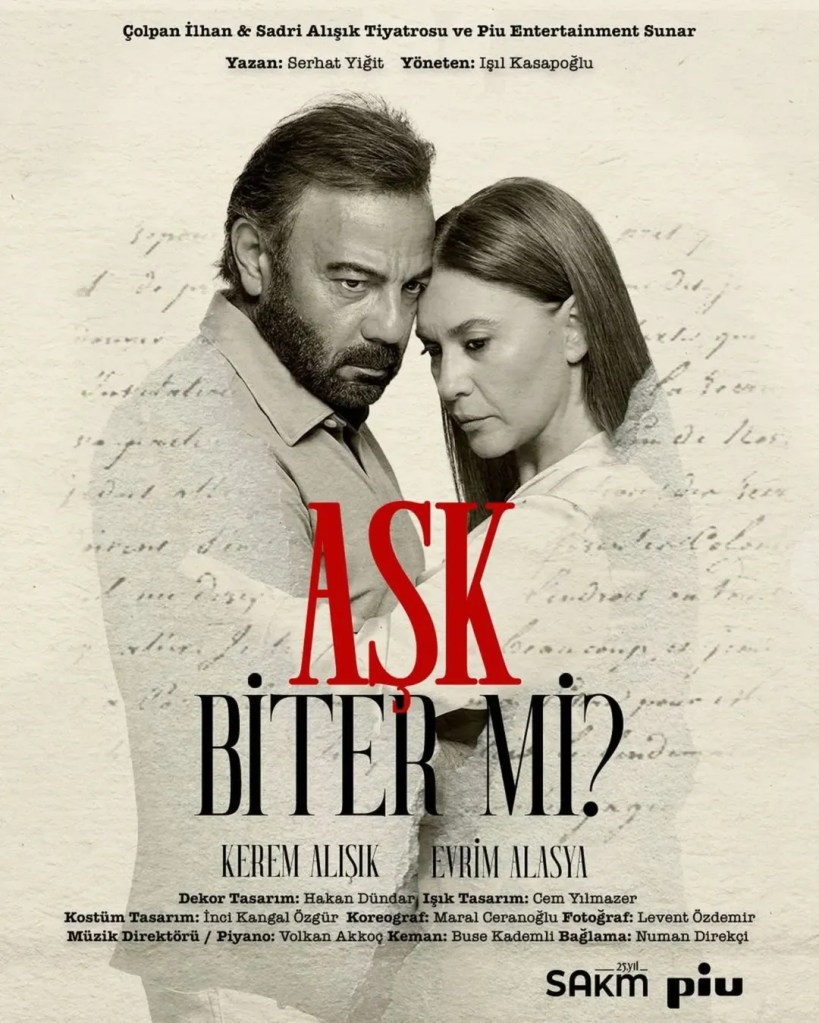 „Piesa de teatru „Aşk Biter mi?/Se termină dragostea?”, cu Kerem Alışık și Evrim Alasya în rolurile principale, a avut reprezentație aseară la Teatrul în aer liber Harbiye Cemil Topuzlu, întâlnindu-se cu publicul. Producția, realizată în colaborare de Teatrul Çolpan İlhan & Sadri Alışık și Piu Entertainment, regizată de Işıl Kasapoğlu, a atras un mare interes din partea iubitorilor de teatru. La final, spectacolul a fost aplaudat minute în șir în picioare de aproximativ 5.000 de spectatori care au umplut Teatrul în aer liber Harbiye. Inspirată din operele unor importanți poeți și scriitori ai literaturii turce, piesa a avut în ultimele săptămâni reprezentații și în Anglia – Londra, Austria – Bregenz și Elveția – Zürich, unde, de asemenea, a fost aplaudată în picioare.” (Hürriyet)