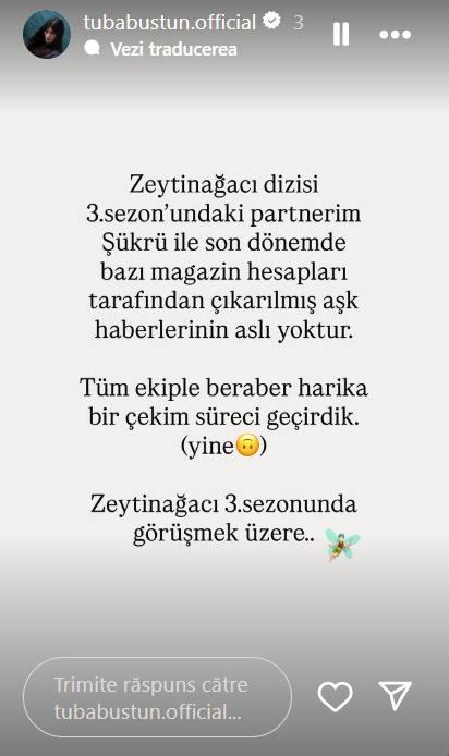 Să ne vedem cu bine în al treilea sezon al serialului Zeytin ağacı.” a scris actrița pe Insta Stories.