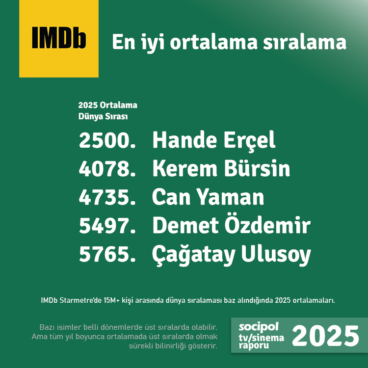 SOCIPOL a calculat și a publicat mediile actorilor turci, din prestigioasa bază de date IMDb, din punct de vedere al locului ocupat în clasament de-a lungul anului 2025.