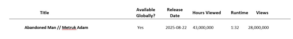 Conform datelor oficiale publicate de Netflix, în a doua jumătate a anului 2025, filmul Metruk Adam, cu Mert Ramazan Demir în rolul principal, a devenit cea mai vizionată producție turcească, înregistrând 28.000.000 de vizionări și 43.000.000 de ore vizionate.