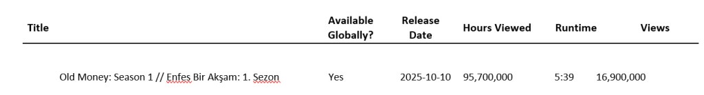 Cu Engin Akyürek și Aslı Enver în rolurile principale, Enfes Bir Akşam (Old Money) a devenit cel mai vizionat serial turcesc pe Netflix în 2025, cu 95,7 milioane de ore vizionate și 16,9 milioane de vizualizări. A fost în 78 de țări în TOP 10.