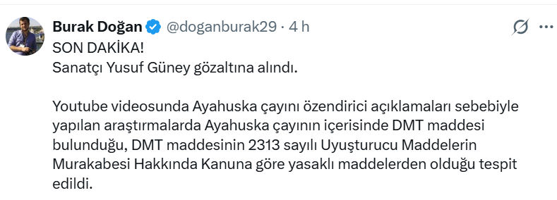 În urma unei anchete declanșată ca urmare a declarațiilor cântărețului Yusuf Güney, de promovare a ceaiului Ayahuasca într-un videoclip de pe YouTube, s-a constatat că ceaiul Ayahuasca conține substanța DMT, care este interzisă în conformitate cu Legea turcă nr. 2313 privind controlul substanțelor stupefiante.